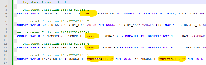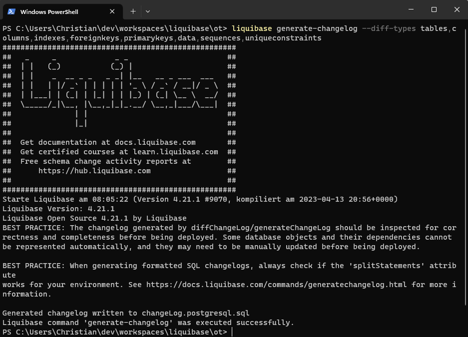 Das Ergebnis des Kommandos befindet sich dann in der Datei changeLog.postgresql.sql wie in liquibase.properties angegeben.