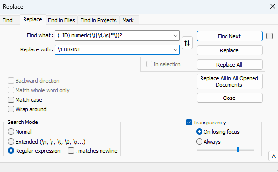 Die Analyse ergibt, dass alle betroffenen PK und FK Columns auf “_ID” enden. Der Feldbezeichnung folgt die Datentypbezeichnung “numeric” und bei den FK Columns (und auch bei manchen PK Columns) folgen anschließend noch verschiedene Längendefinitionen wie z.B. “(12, 0)”. Dieses Muster lässt sich mit einem RegEx finden und durch den gewünschten Datentyp ersetzen. Der Einfachheit halber wird als Korrektur für alle Surrogatschlüssel der größtmögliche Datentyp BIGINT gewählt.